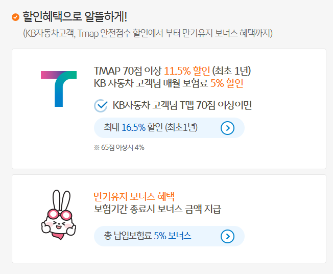 KB손해보험 다이렉트 상품으로 3대 운전자 특약으로 대비를 할 수 있으며 KB자동차 보험 고객중 T맵 70점 이상에 해당하는 경우 최초 1년 11.5%의 보험료 할인과 이후에는 5%의 할인을 받을 수 있습니다.