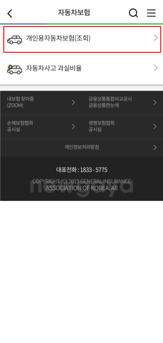 2. 개인용자동차보험 조회 메뉴를 선택합니다.