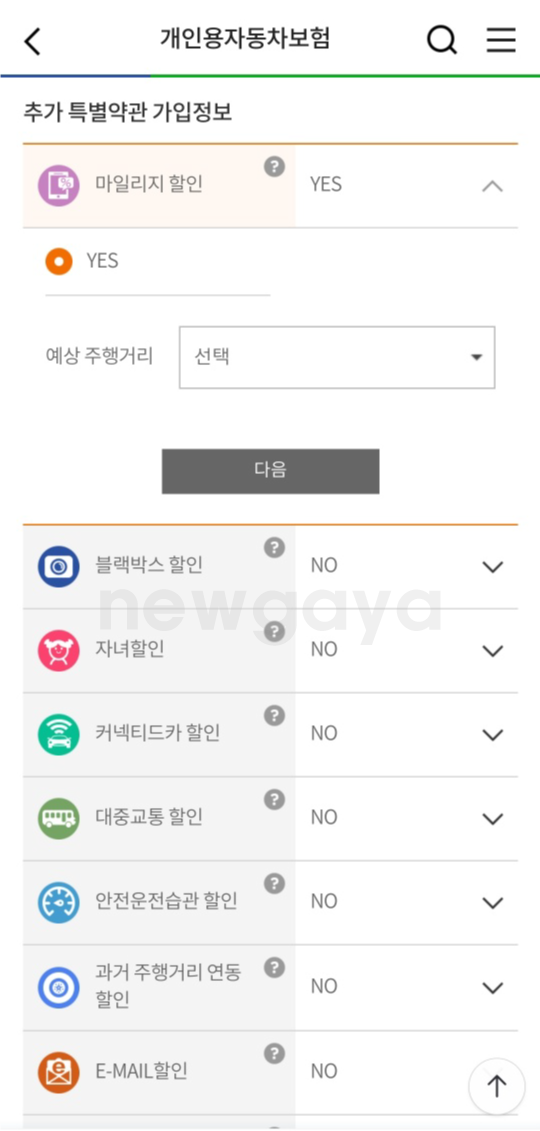 6. 추가 특별 약관에 대한 정보를 선택합니다.(마일리지 및 추가 할인 특약 가입 선택)