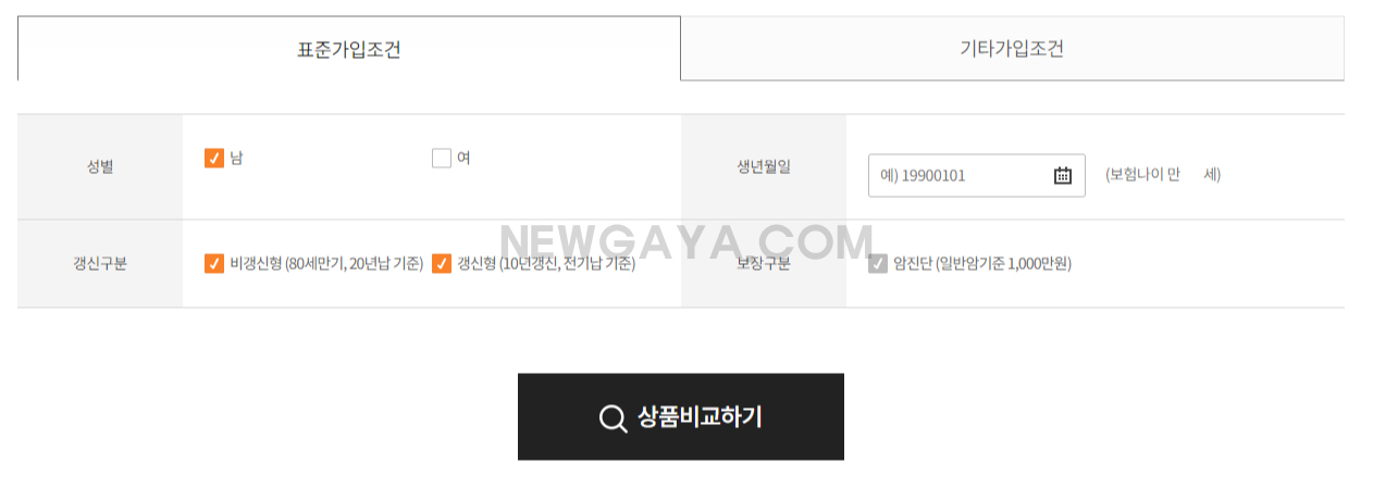 3. 성별, 생년월일 입력 후 비갱신형 체크하여 하단의 상품비교하기 선택
