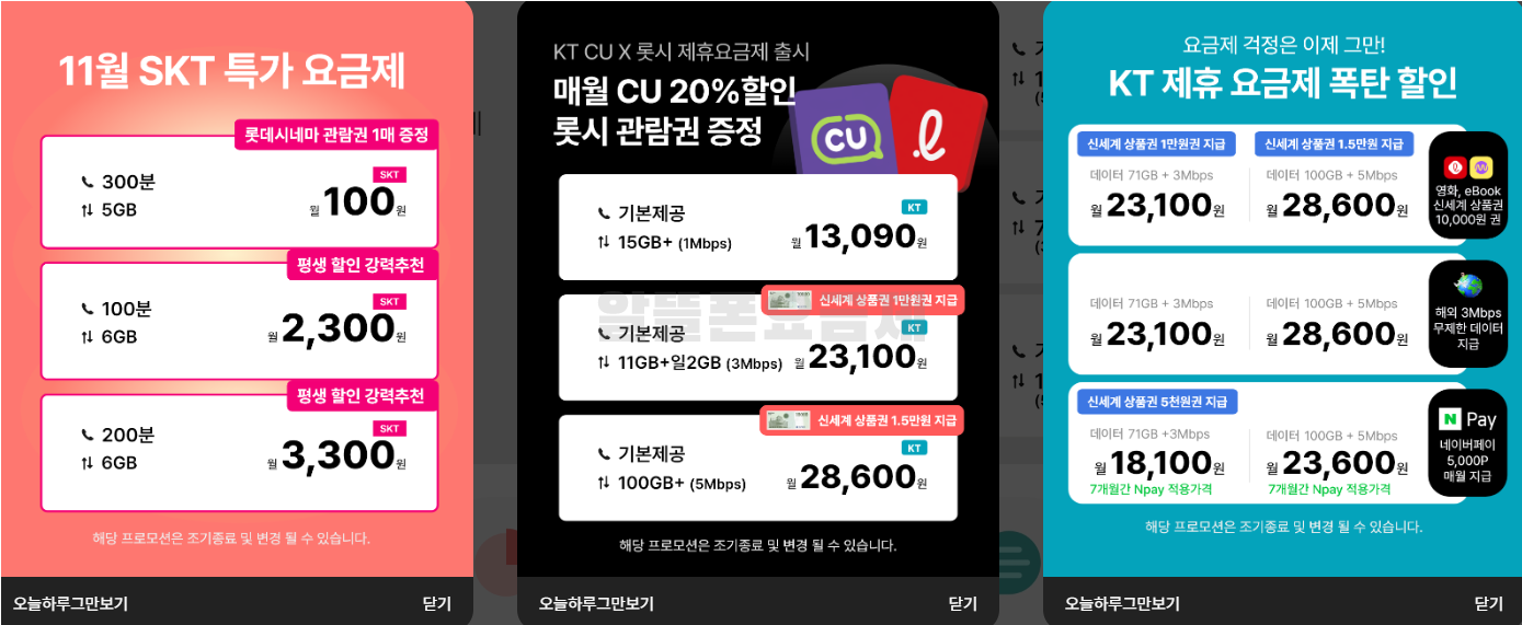 각 요금제에서 제공하고 있는 부가적인 서비스를 함께 고려하시길 바랍니다. 예를들어 특정 플랫폼의 포인트를 제공하는 경우가 있는데, 만약 본인이 해당 플랫폼을 이용하지 않는 경우라면 굳이 이용할 필요가 없는 것입니다.