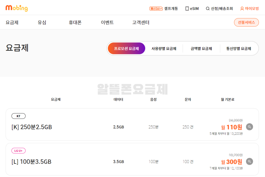 모빙은 대표적인 알뜰폰 업체 입니다. 해당 업체에서 제공하고 있는 SKT, KT, LGU+의 요금제를 비교해보실 수 있는데, 프로모션 요금제 및 사용량별, 금액별, 통신망별로 정렬하여 확인해 보실 수 있습니다.